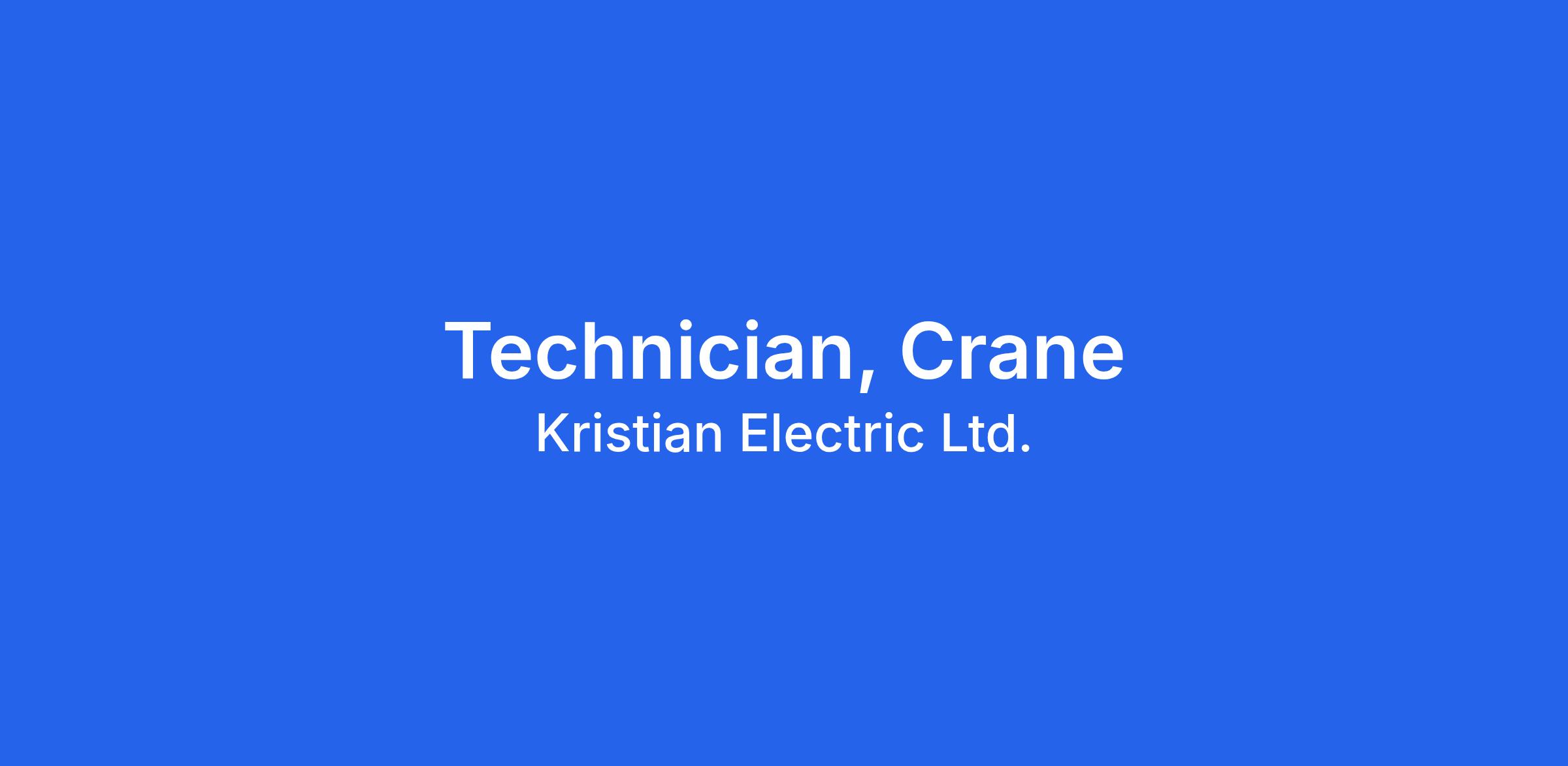 Kristian Electric Ltd. (Calgary AB): Job Description – Overhead Crane Service Technician. Calgary Kristian Electric is looking for an Overhead Crane Service Technician to join our Calgary branch. As a Crane Technician, you will be responsible for servicing, troubleshooting, and the installation of overhead cranes and hoists in our shop and at customer job sites. The successful candidate will be:. Reliable and organized with maintaining and working with project deadlines and customer requests. Exceptional at building customer...